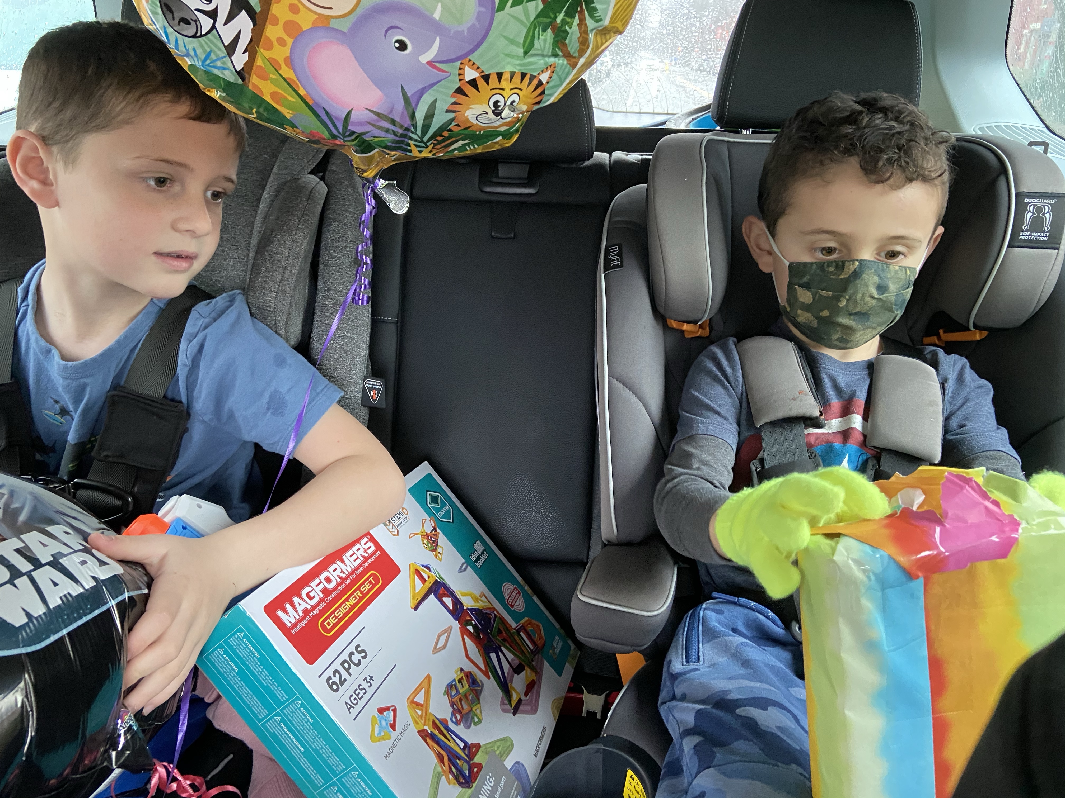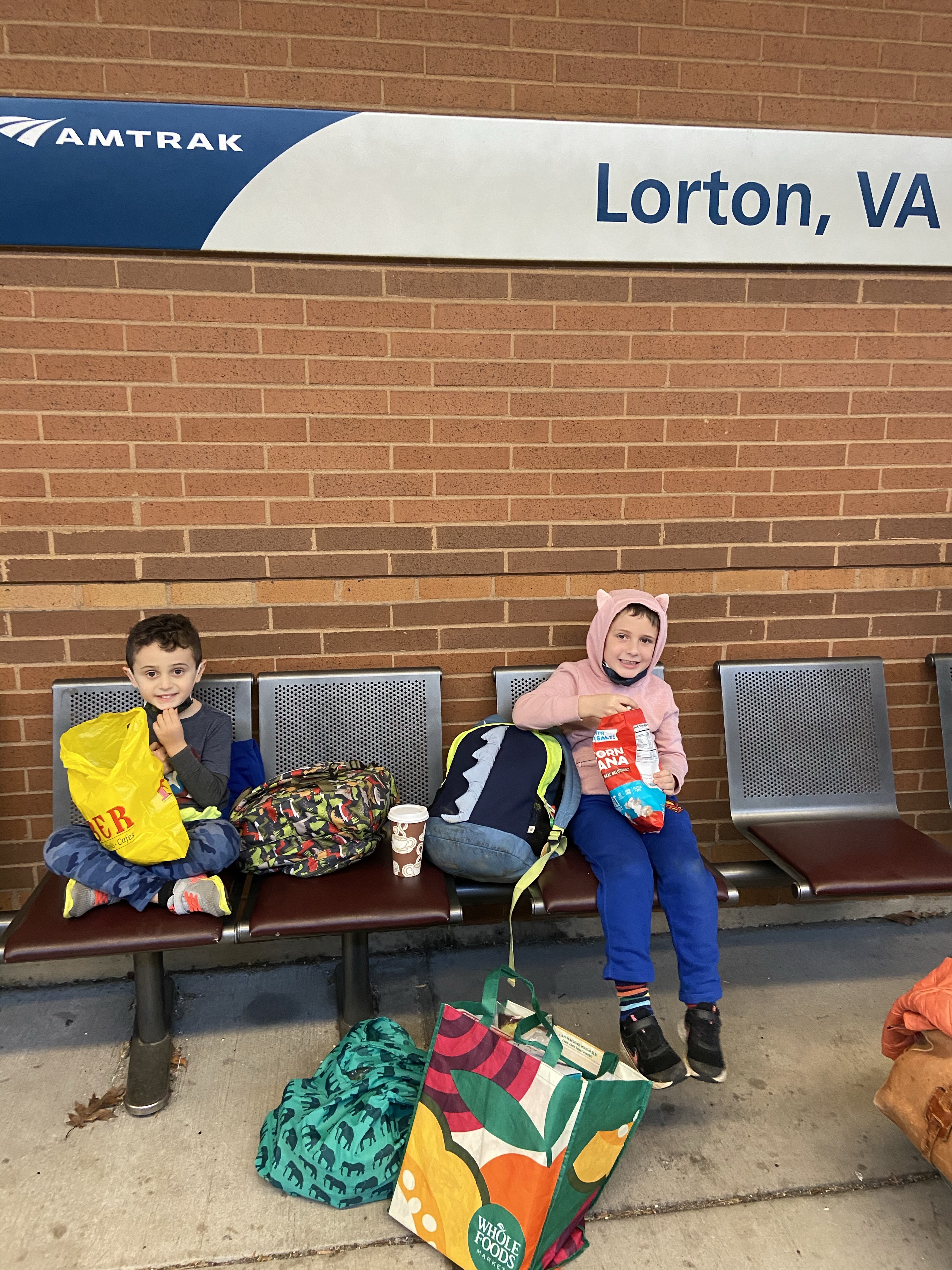 Opening presents in the car on the way to the auto train, and then waiting on the train platform to board. One of the bday balloons definitely flew out the window 😬